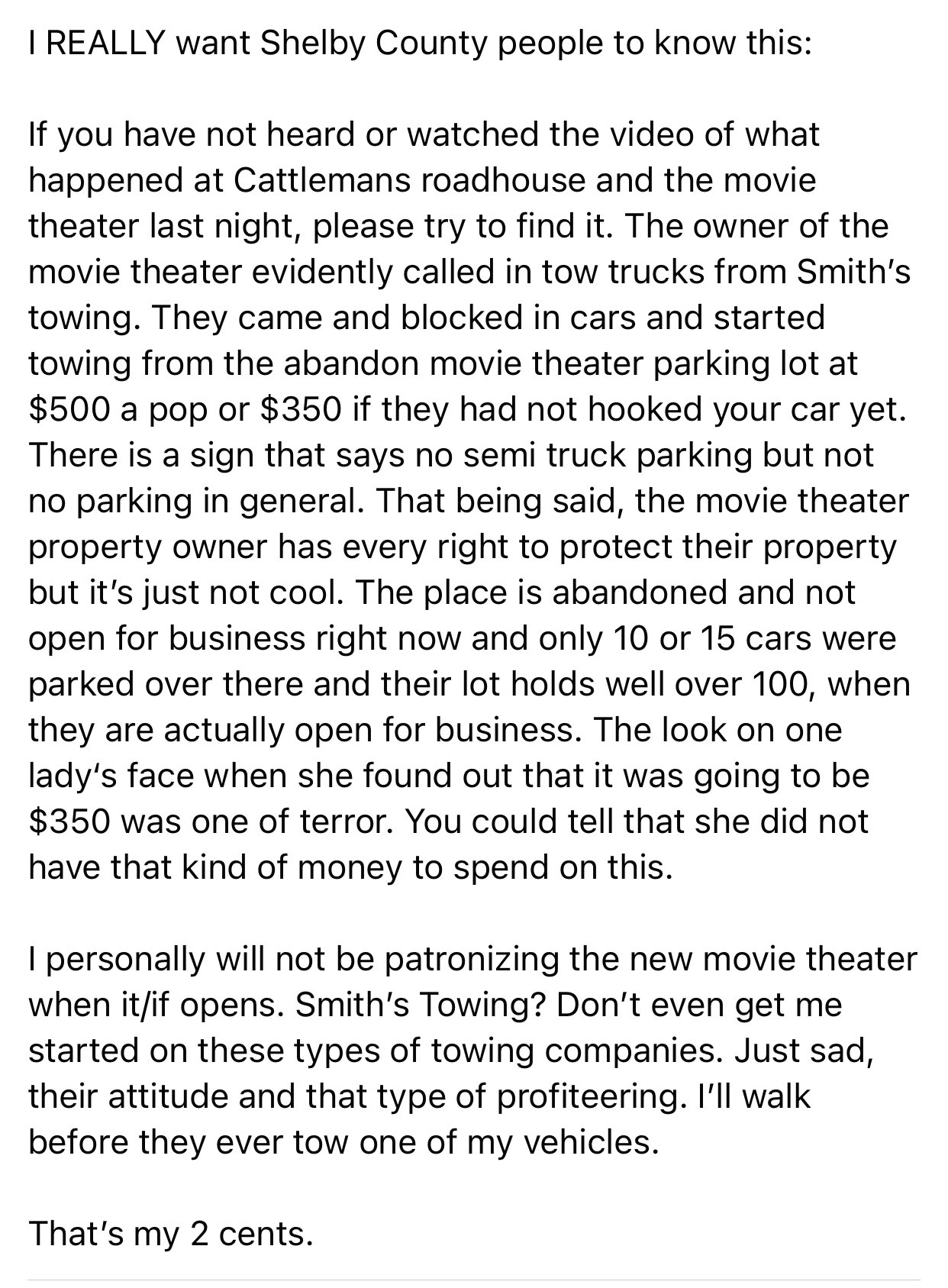 Matt Jones On Twitter Major Drama In Shelbyville Cattleman S Restaurant Was Full On Sat Night And People Parked At Movie Theater Parking Lot Across Street Which Isn T Open Owner Has All Cars